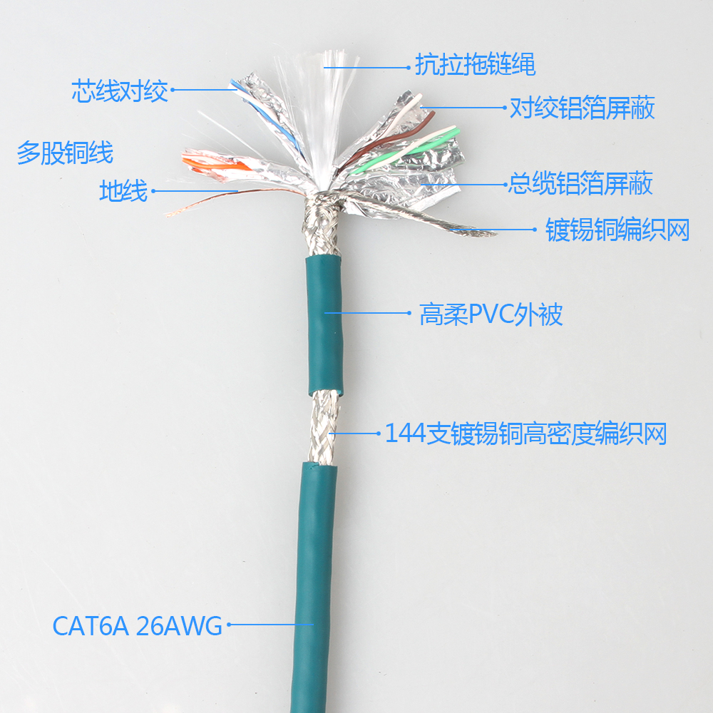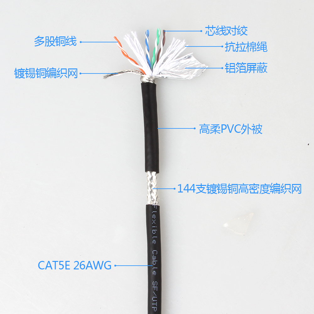 工業用以太網線屏蔽鍍錫軟銅絲編織,屏(píng)蔽密度≥85%.抗磁抗幹擾。